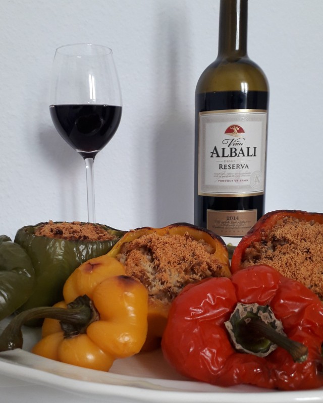 Para acompañarlo, me decidí por unos pimientos asados rellenos de arroz, carne y cebolla, especiados al clavo y albahaca, con una salsa de tomate y cerveza tostada, con queso por encima. Un acierto total.