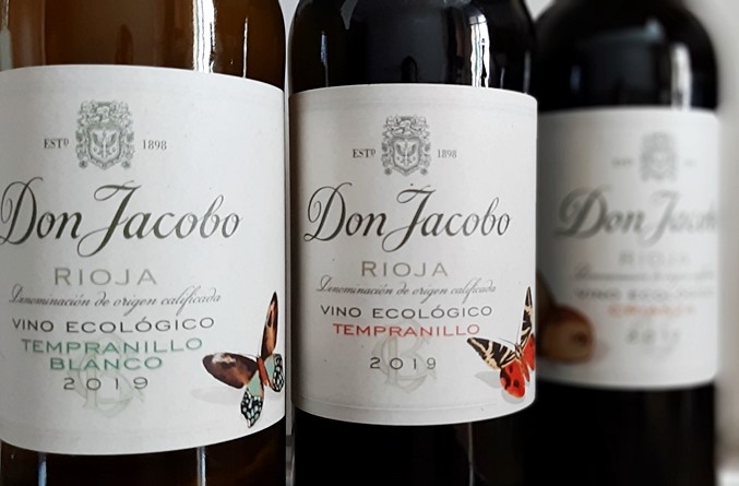 El último para cerrar esta serie de nuevas añadas ecológicas es Don Jacobo Ecológico Crianza 2017. Un varietal de Tempranillo y Graciano, ambos al 50%, con una crianza de 12 meses en roble americano nuevo y otros 6 meses más de estabilización en botella. Con él podemos disfrutar de dos de las tres zonas que comprende Rioja. Por un lado la variedad Tempranillo procedente de viñedos localizados en Rioja Alta, y por otro la variedad Graciano cultivada en la Rioja Oriental. El coupage nos ofrece un vino con buena intensidad aromática, complejo, de notas lácticas, voluminoso en boca, que tras su paso deja un agradable y largo final. La madera está presente en su justa medida, muy de fondo.