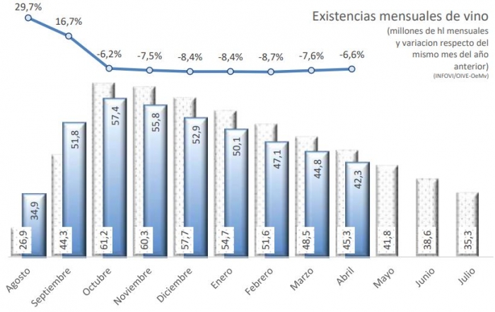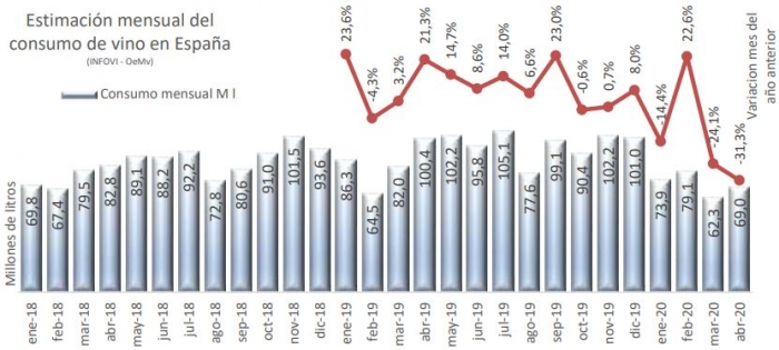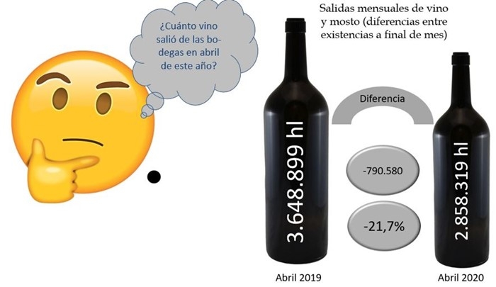 Mes a mes, este dato significa que, entre marzo y abril de este año, la disminución de existencias en bodega fue de 2,5 millones de hectolitros (2,8 Mhl si añadimos el mosto): desde los 44,8 M hl a los mencionados 42,3 M hl. Una disminución y por lo tanto unas "salidas" de vino de las bodegas, que es un 21,7% inferior en el mes de abril de este año a los 3,2 M hl que salieron en abril del '19.