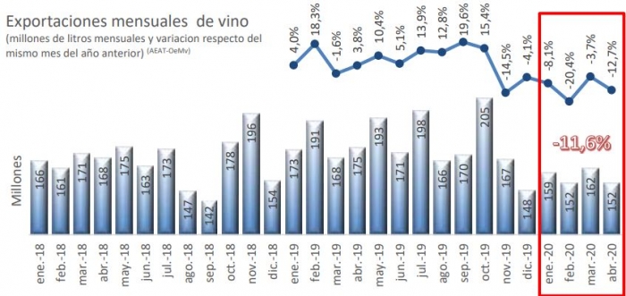 Tras una cosecha más corta de lo esperado, pero aún con existencias de 2018 relativamente altas, veníamos de acabar 2019 con aumento de ventas exteriores de vinos del 6,5%, pero caída del precio medio en casi un 14%, lo que daba lugar a una merma de la facturación del 8%. Más vino, pero más barato.