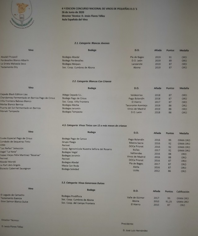 Tras la cata a ciegas, en la que se cataron cerca de 80 muestras procedentes de 27 Pequeñas D.O.'s distribuidas a lo largo y ancho del territorio nacional, el jurado destacó la calidad en general de los vinos presentados (se otorgaron un total de 6 GRANDES OROS) y valoró muy positivamente la riqueza vinícola que tenemos en nuestro país, así como la diversidad de los vinos presentados, entre los GRANDES OROS encontramos vinos de Pequeñas D.O.'s tan dispersas como Pago Bolandín, en Navarra, Bodega Condado de Siqueira en la Pequeña D.O. gallega Ribeira Sacra, Perinet en la Pequeña DOCa Priorat en Tarragona o de la Bodega Nuestra Señora del Rosario en la Pequeña D.O. murciana, Bullas, por su parte los vinos generosos galardonados con GRANDES OROS fueron en ambos casos de Pequeñas D.O'.s tinerfeñas, como son Bodegas Prodiflora de la Pequeña DO Valle de Güimar o la Sociedad Cooperativa Cumbres de Abona en la Pequeña D.O. Abona.