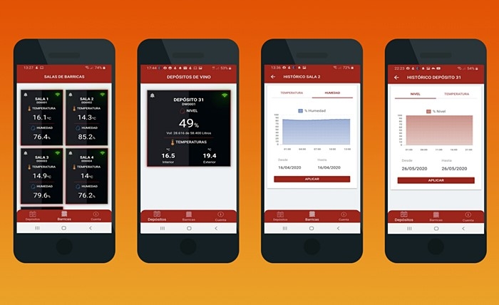 ¿Cómo conseguimos tener esta información tan importante al minuto y en nuestros dispositivos móviles? A través de una aplicación desarrollada por la empresa Perfect Numbers las bodegas consiguen monitorizar sus vinos de forma ágil, rentable y en tiempo real, gracias a la interconexión de tanques a través de sensores inalámbricos instalados en los depósitos industriales que nos permitirán medir las propiedades del contenido, como volumen o temperatura, con un sistema de datos que los recolecta y los muestra. Estos datos se vuelcan a la aplicación que los recoge en tiempo real permitiendo a través de un sistema de monitorización que recoge métricas y mantiene a las empresas informadas sobre sus depósitos 24 horas al día, siete días por semana, ahorrando en logística y recursos humanos. Todos estos datos permitirán, además, que el enólogo responsable pueda tomar decisiones sobre los vinos en función de su evolución, visualizar incidencias o crear informes que le permitan desarrollar de forma más eficiente su trabajo.