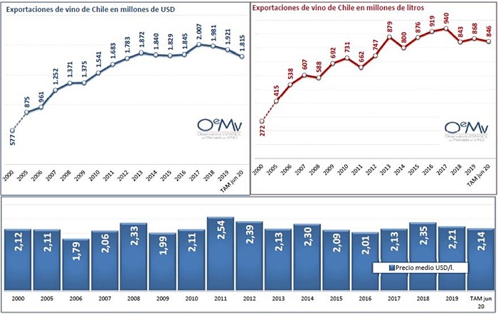 Según datos de la aduana chilena, analizados por el Observatorio Español del Mercado del Vino (OeMv), en los últimos 12 meses las exportaciones de vino chileno cayeron un 2,4% en volumen y un 8,8% en valor en el interanual a junio de 2020, hasta situarse en los 846,5 millones de litros y en los 1.814,7 millones de dólares. El precio medio subió un 6,6% hasta los 2,14 USD/litro. Todos los vinos cayeron en valor, siendo el bag-in-box el que menos lo hizo, tras la buena marcha del primer semestre. En volumen, el BiB fue el que más creció, con ligerísimo aumento del granel y caída para envasados y espumosos.