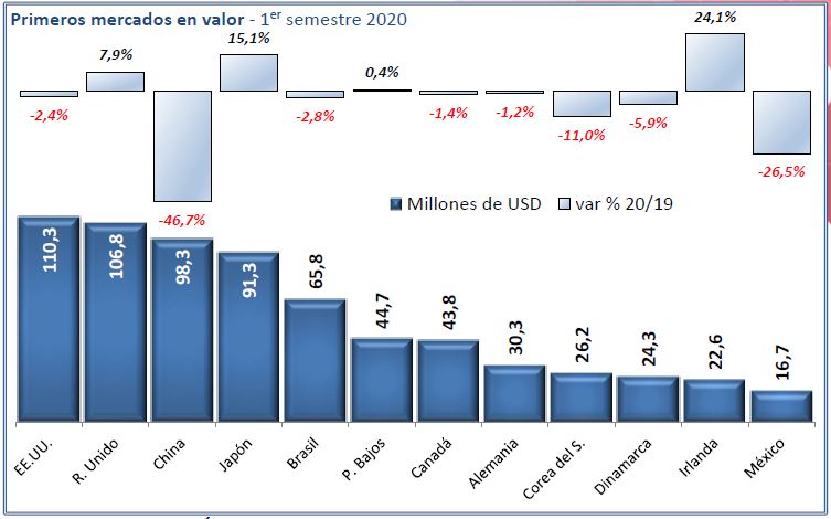 Las exportaciones de granel chileno a China se desplomaron en este primer semestre un 64% en volumen pese a abajar el precio un 19%, con caída aún mayor por tanto en valor (- 71%). China ha pasado de primer a cuarto mercado en volumen; Estados Unidos, Reino Unido y Alemania, cuyas ventas crecieron notablemente, le superan en el ranking, aunque la caída de China es demasiado acusada como para impedir que Chile redujera sus ventas globales de granel. Además, el gran desarrollo de estos tres países se ha producido a precios mucho más bajos, que moderaron bastante la subida en valor. Respecto a otros mercados, buenos datos para Canadá, con fuerte caída de Japón, Países Bajos y Bélgica.