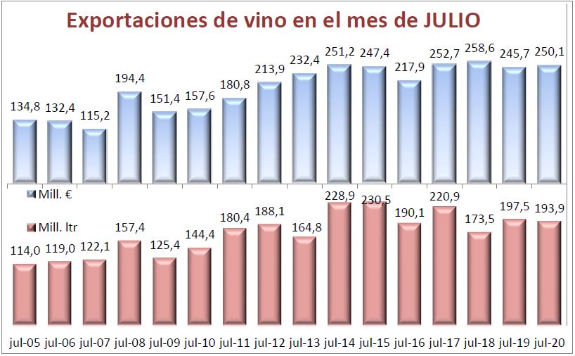 En julio, se registró una ligera caída del volumen exportado del -1,8%, muy concentrada en las ventas de vino a granel, del que se dejaron de exportar en el mes, 7,8 millones de litros, y un aumento en valor del mismo porcentaje (+1,8%), gracias a la buena marcha de los vinos tranquilos envasados y de los bag-in-box. España exportó, el pasado mes de julio, 193,9 millones de litros, por valor de 250,1 millones de euros. Es decir, exportó 3,6 millones de litros menos, pero facturó 4,4 millones de euros más.