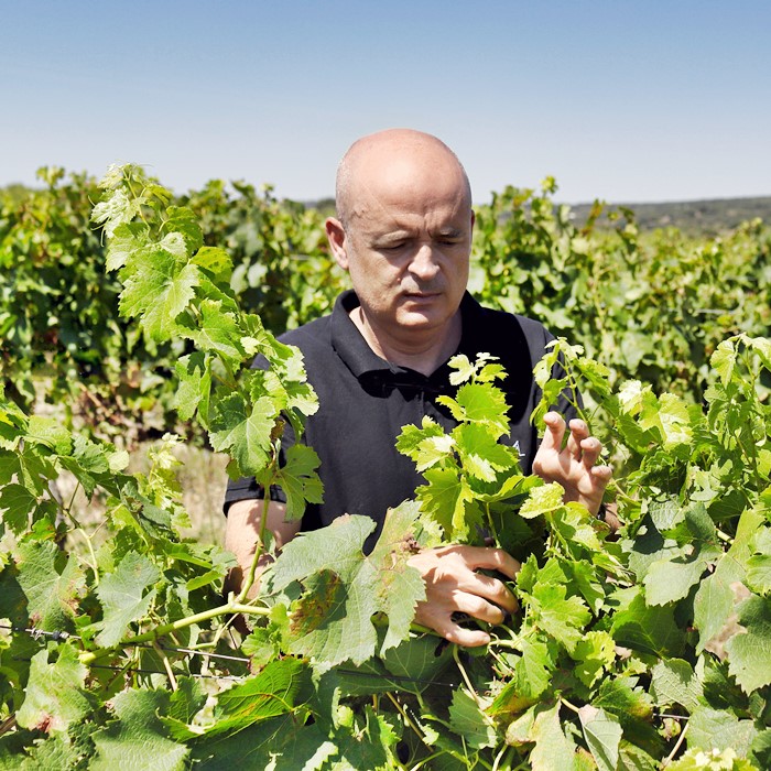 En el caso de los tintos, hacemos una vendimia manual en cajas de 14 kilos. Para ello, utilizamos dos mesas de selección manual. Hacemos un primer cribaje de racimos que no estén en un estado sanitario perfecto y en la segunda mesa se realiza la selección grano a grano retirando todos aquellos que no estén perfectamente maduros, pequeños restos de material vegetal como hojas, tallos, etc. Una vez encubada la uva, se realiza una criomaceración con hielo seco antes de fermentar y posteriormente una maceración postfermentativa. Realizamos la fermentación maloláctica en barricas nuevas de roble francés, así como la crianza del vino. Esta depende de cada variedad y, prácticamente, de cada añada adaptando el tiempo de crianza a las necesidades del vino. Posteriormente, elegimos de cada finca qué barricas y que proporción de variedades van al coupage definitivo antes de embotellar.