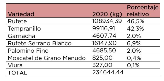 Por variedades, el 47% de la uva ha sido de la variedad autóctona Rufete (108.934,39 kg), mientras que el 42% ha sido de Tinto Aragonés (Tempranillo). Cabe destacar que el 6,9% de la producción total corresponde a la recientemente reconocida por el BOCYL Rufete Serrano Blanco, lo que significa que los elaboradores de la zona ya confiaban en el potencial enológico de esta casta desde hace años.