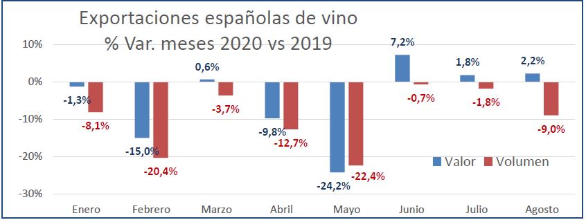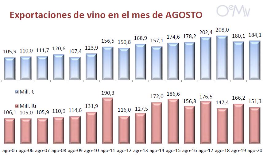 En el mes de agosto de 2020 y por tercer mes consecutivo, crecen las exportaciones españolas de vino en términos de valor (+2,2%), aunque se reduce el volumen exportado un -9%, según el último informe del OEMV publicado esta semana.