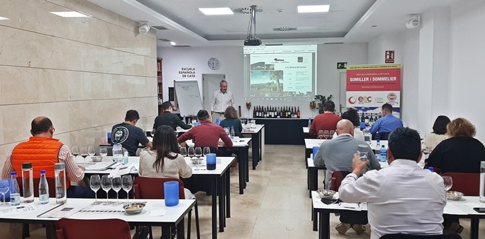 Tengo el placer, y a la vez el privilegio, de unirme a tan señalada edición para la cual la EEC ha preparado en su parte presencial una cata muy especial. Los alumnos del curso han podido completar parte de su formación gracias a la ponencia y cata dirigida por Álvaro Pérez Navazo, Director de la Academia del Terroir de Abadía Retuerta, conociendo estos singulares vinos y sus bodegas a través de un amplio recorrido, catando 19 elaboraciones calificadas como Grandes Pagos de España y Vinos de Terroir procedentes de diferentes localizaciones. Gran variedad en elaboraciones en las que, tanto los alumnos como un servidor, pudimos conocer y apreciar en su cata vinos de gran calidad, de diferentes variedades de uva, de sensaciones, tanto en aromas como en sabores, y de diferentes técnicas de elaboración,...etc. donde los vinos presentados de las diferentes bodegas buscan la máxima expresión del terroir. Tres horas para aprender, para disfrutar, y lo más importante; para adquirir los conocimientos necesarios que servirán a los alumnos de cara a su formación como profesionales del sector.