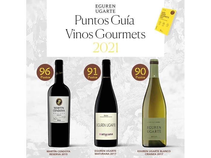 La 36 edición de la Guía de Vinos Gourmets 2021, Los Mejores de España, www.gourmets.net, que nos introduce en el fascinante mundo de más de 3.740 vinos catados y 1.112 bodegas, ha calificado tres vinos de Eguren Ugarte: Martín Cendoya Reserva 2015, Eguren Ugarte Maturana 2017 y Crianza Blanco 2017 como vinos de 90+ puntos.