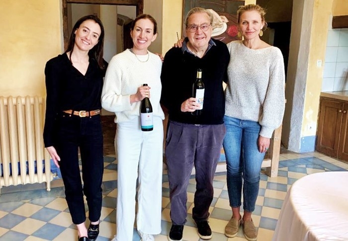 De derecha a izquierda: Cameron Diaz, Carlos Esteva, Katherine Power y Alexandra Manovel (responsable de exportación de Can Ràfols dels Caus) en la cocina de la "masía" de Can Ràfols dels Caus