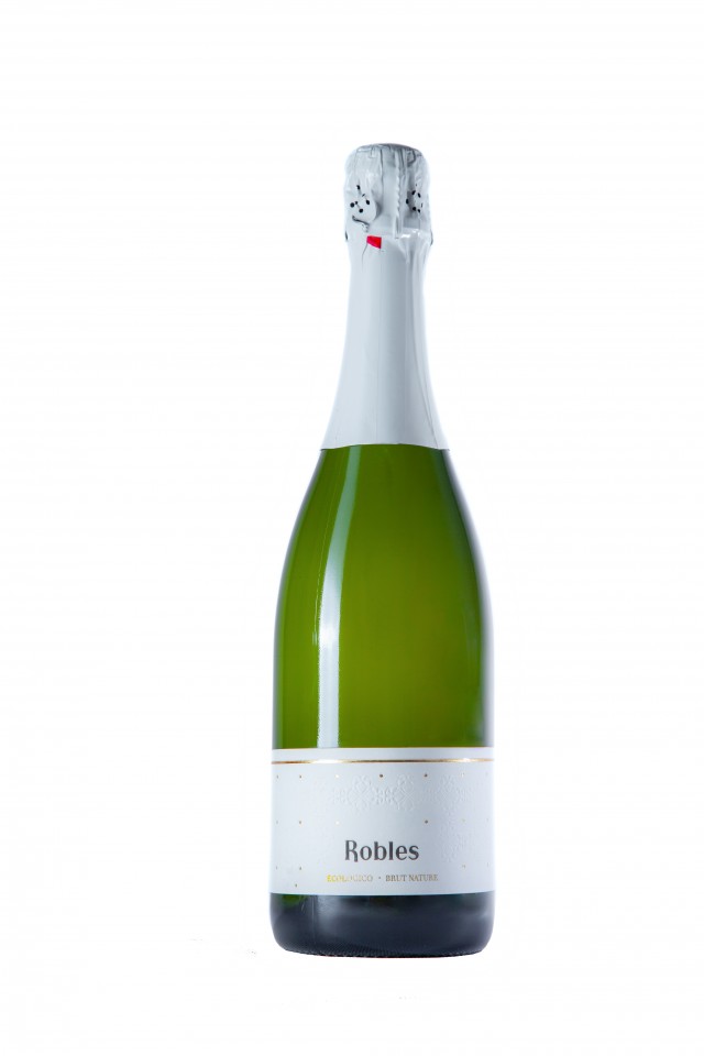 ROBLES Brut Nature Pedro Ximénez 100% procedente de su viñedo ecológico Villargallegos, entre las provincias de Córdoba y Málaga.