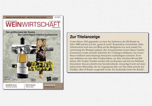 La Seca, 4 de febrero de 2021.- La prestigiosa revista alemana 'Weinwirtschaft', editada por el grupo Meininger, dedica su número del mes de febrero a la Denominación de Origen Rueda y lleva como destacado en su portada el verdejo Cuatro Rayas Viñedos Centenarios de la bodega cooperativa ubicada en la localidad vallisoletana de La Seca.