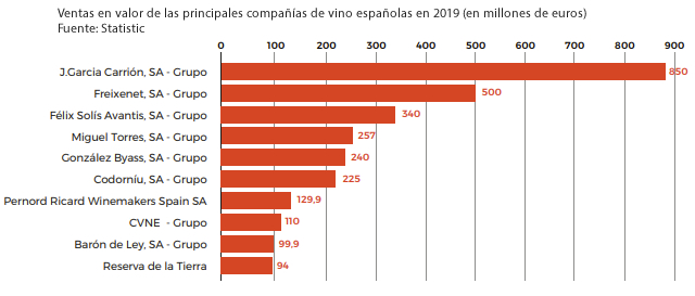 Las principales empresas productoras de vino de España concentraron 2.845,8 millones de euros en ventas en 2019, lideradas por J.García Carrión, que con 850 millones de euros en ventas controla el 10% del mercado. Esta es seguida por Freixenet (500), Félix Solís (340), Familia Torres (257) y Gonzalez Byass (240). Las marcas más vendidas de vino tranquilo son Marqués de Cáceres, Protos, El Coto, Cune y Terras Gauda, mientras que las de vino de Jerez son Tío Pepe, La Guita, Port Brands y La Gitana.