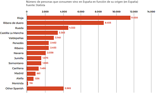 En este sentido, los vinos más consumidos en España son los que tienen Denominación de Origen, siendo DOCA Rioja el origen más demandado (11.630 miles de personas lo consumieron en 2019), seguido de DO Ribera del Duero (8.455), DO Rueda (4.322), DO La Mancha (3.383), y DO Valdepeñas (3.148). Por canales, el 67,7% de las ventas se producen en supermercados, el 14,6% en hipermercados, el 1,8% en ecommerce, el 1,2% en tiendas especializadas y otro 1,2% en cooperativas.