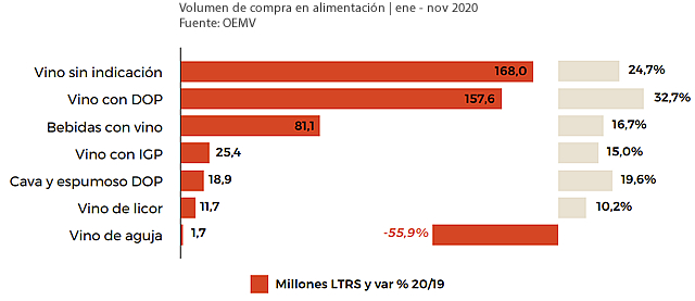 Según EAE Business School, con datos del MAPA, la compra de vino en canal Alimentación ha crecido un 25% durante los 11 primeros meses de 2020. Los vinos que más se han demandado en las tiendas son, igual que en el consumo global, los que tienen denominación de origen, un 31,3% en valor y un 32,7% en volumen, respecto año anterior.