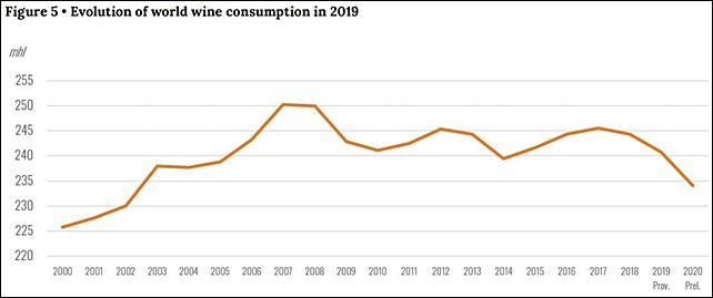 El consumo mundial de vino en 2020 se estima en 23.400 millones de litros, marcando una disminución del 3% en comparación con 2019 y alcanzando el nivel de consumo más bajo registrado desde 2002.