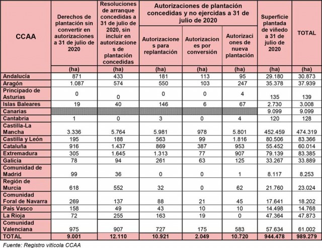 Así en 2020 se concedieron autorizaciones para 4.750 hectáreas de nuevas plantaciones, para 17.688 hectáreas en replantación y para 1.242 hectáreas como conversión de derechos de replantación.