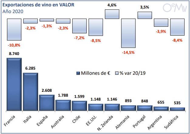 Francia lideró un año más el valor de las exportaciones mundiales de forma clara, pese a caer un 10,8% hasta bajar ligeramente de los 8.740 millones de euros. El vino francés supuso casi la mitad de las pérdidas mundiales en valor, al caer en 1.059 millones de euros, para un descenso global de 2.096 millones. Sigue registrando un precio medio muy superior al resto, con 6,43 €/litro, pese a bajar un 6,2% el pasado año. Italia repite como segundo vendedor en valor con 6.285 millones de euros (-2,3%), seguido de los 2.607,7 millones de España (- 1,3%).