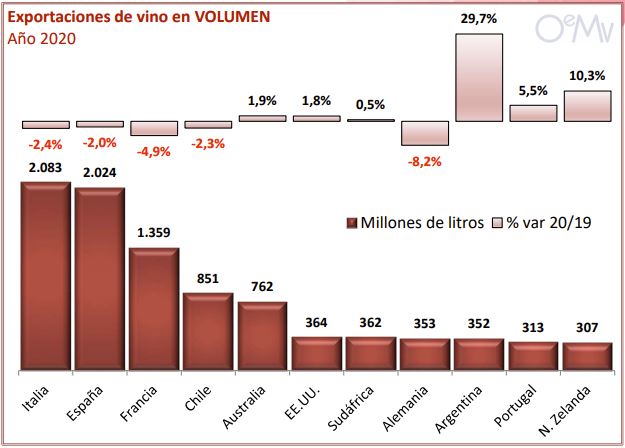 Las ventas de vino español cayeron menos que las de italiano y francés, tanto en valor como en volumen La suma de los tres primeros proveedores mundiales (Italia, Francia y España) representó en torno al 53% del volumen y al 59% del valor total de vino exportado a nivel mundial durante 2020.