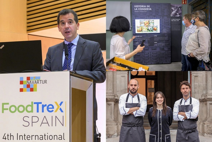 Mikel Irujo, Consejero de Desarrollo Económico y Empresarial de Gobierno de Navarra, inaugura FoodTrex Spain 2021. Dcha., Museo de la Conserva (arriba) y propietarios de Hamabi. MA-HB.