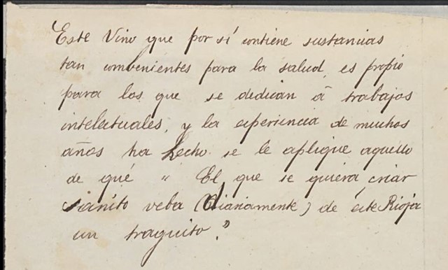 En la imagen el primer anuncio publicitario en venta directa de la marca Pobes: «Este vino que por sí contiene sustancias tan combenientes para la salud es propio para los que se dedican a trabajos intelectuales, y la experiencia de muchos años ha hecho se le aplique aquello de qué “El que se quiera criar sanito veba (diariamente) de este Rioja un traguito”» (Propuesta de publicidad a Galo de Pobes por parte de José Blanco, 1875).