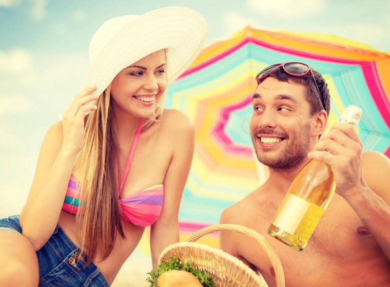 Una buena idea es llevar un vino de aguja blanco o rosado. Las notas afrutadas y las finas burbujas nos refrescarán y ayudarán a tener una sensación ligera. Como estos vinos necesitan una temperatura de servicio fría, llévalos en la nevera bien provista de hielo.