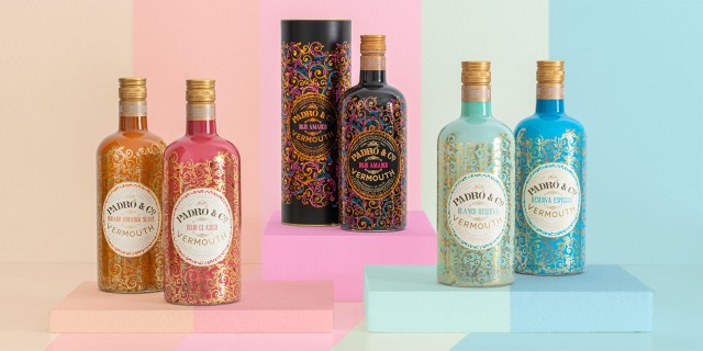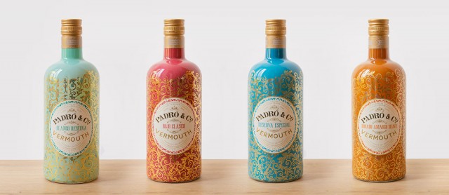 Una de las claves del diseño de botellas es que se reconozcan fácilmente de lejos. Este es el caso de los vermuts Padró & Co., que cuentan con un packaging llamativo, con diferentes gamas cromáticas y decoradas con arabescos metálicos que causan impacto. Estamos ante un diseño que seduce la vista e invita a probar su contenido.