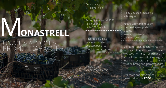 Es la favorita de Jumilla por su capacidad de adaptarse a las condiciones del terreno, la cepa Monastrell de brotación y maduración tardía se las apaña para prosperar en las tierras del levante español, un área que recibe los vientos del mar mediterráneo, y escasas lluvias. Es rústica y tiene una gran resistencia a la sequía. Así que contrasta bien con las pocas precipitaciones que recibe esta región.