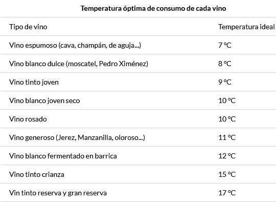 La tabla que presenta la OCU representa las temperaturas que se recomiendan para cada uno de los vinos según su tipo. Puedes usarla como referencia: