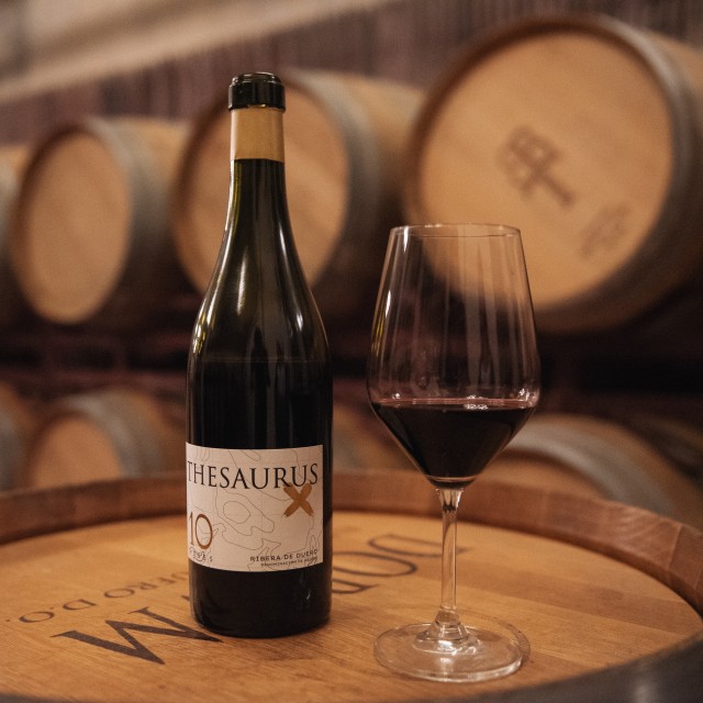 Thesaurus significa tesoro en latín y la X hace mención en números romanos a los diez meses que pasa en barrica para conseguir su extraordinario sabor. Es un vino afinado elaborado con variedad 100% tempranillo de la Denominación de Origen Ribera del Duero y cuenta con muy poco filtrado gracias a su calidad, estabilidad y limpieza. Presenta un color rojo picota intenso y en nariz destacan los chocolates, mocas y frutas como la mora y la grosella. En boca encontramos una entrada suave, con un paso equilibrado y un posgusto interesante que te invita a descubrir un nuevo viaje.