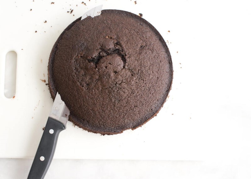 Vierte con cuidado la ganache sobre el bizcocho con cuidado y desde el centro para que se reparta bien. Deja que se enfríe totalmente antes de servir. Si lo prefieres, también puedes cortar el bizcocho, una vez frío, de manera transversal, como en la imagen inferior, y hacer un pastel a capas usando la misma crema ganache: bizcocho-crema-bizcocho-cobertura