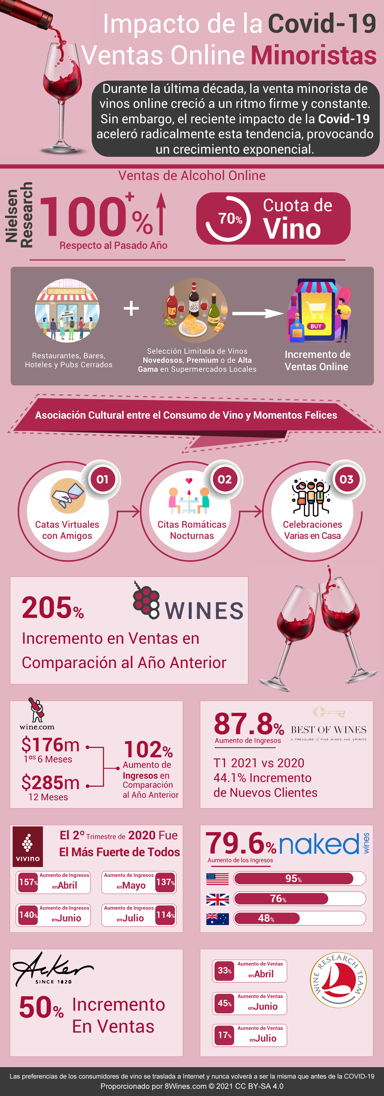 Cuando las restricciones de cierre cerraron restaurantes y pubs durante la noche, los consumidores de vino se quedaron en casa con pocas alternativas. Los datos muestran que el aumento de las ventas durante el primer cierre se debió a la asociación cultural del consumo de vino con ocasiones felices, como catas virtuales con amigos, noches de citas románticas y otros momentos significativos que la gente se vio obligada a quedarse en casa. En esta situación, y ante una oferta limitada de vinos de calidad, de mayor valor o más atractivos, los consumidores se volcaron hacia la compra on line. Los vendedores de vino online registraron así un crecimiento de las ventas de tres dígitos mientras los consumidores se quedaban en casa durante la pandemia de COVID-19.