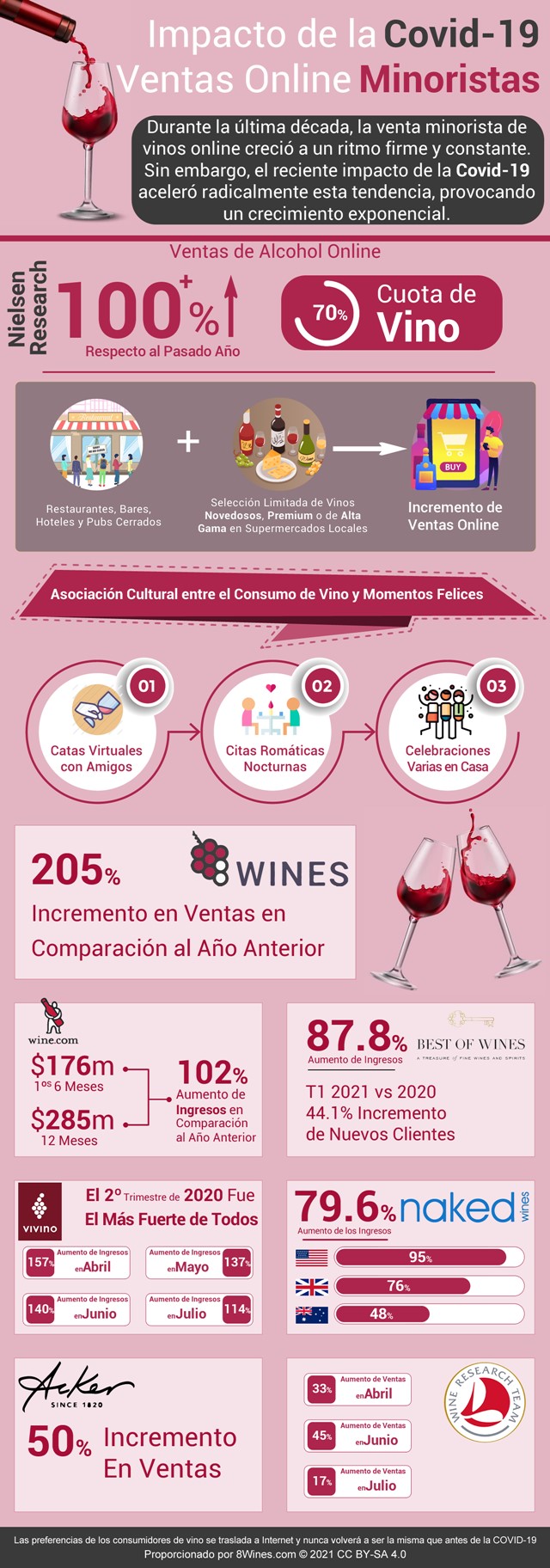 En 8Wines.com también han aumentado sus ventas en más de un 205% en 2020 con un volumen de crecimiento que se mantiene en este año. Según destacan desde al empresa, "nuestros clientes prefieren cada vez más vinos nuevos y emocionantes de lugares exóticos y de nuevas variedades emergentes". "Nuestros clientes ya no se conforman con los vinos que pueden encontrar en sus supermercados locales o en las tiendas de vino tradicionales. Vemos que, a medida que los amantes del vino se van adaptando y se dan cuenta de lo fácil que es comprar un buen vino en línea, se convierten en clientes digitales a largo plazo".