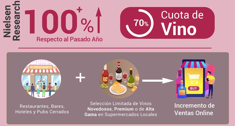 Según la investigación de la consultora Nielsen, el comercio electrónico de alcohol se ha duplicado con creces en comparación con el año pasado por estas fechas, y el vino es el que más ha disfrutado de los beneficios de este cambio, ya que representa casi el 70% del total de las ventas en línea.