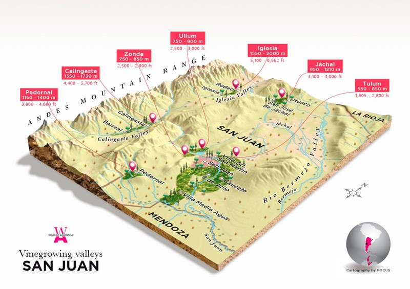 En la vasta extensión de la Argentina vitivinícola, la provincia de San Juan, es la segunda (tras Mendoza) con más superficie de viñedos implantados (31.960,5 hectáreas según los últimos datos de Wines of Argentina) lo que equivale al 16% de la superficie total del país. Con altitudes que oscilan entre los 550 a 2.000 msnm se destacan los valles del Valle del Pedernal, Calingasta, Zonda, Ullum, Iglesia y Jáchal.