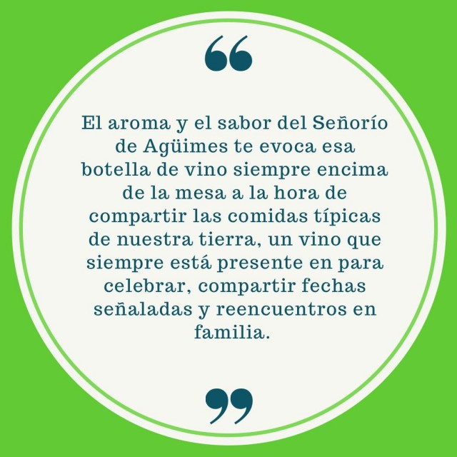 El aroma y el sabor del Señorío de Agüimes te evoca esa botella de vino siempre encima de la mesa a la hora de compartir las comidas típicas de nuestra tierra, un vino que siempre está presente en para celebrar, compartir fechas señaladas y reencuentros en familia. Su elaboración empieza desde el mimo de la viña, los trabajos en la tierra, pasando por su recolección, elaboración y cuidados en la bodega, el resultado son vinos inolvidables y de producción limitada. En definitiva, se busca la excelencia con unos viñedos de más de 20 años, localizados en el municipio de Agüimes, unidos a la recuperación de la tradición, obteniendo así unos vinos únicos y diferentes.