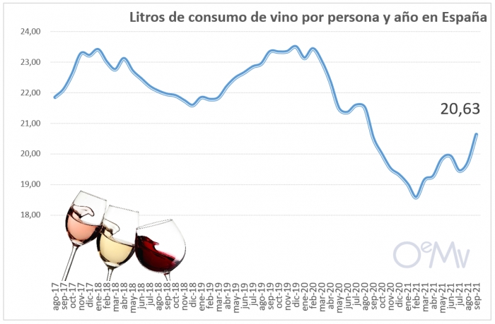 El consumo de vino per cápita en España ha vuelto a superar en septiembre de este año el umbral de los 20 litros por persona y año, que no alcanzaba desde hace 12 meses. Aunque todavía lejos del récord reciente marcado en diciembre del 2019, cuando superó los 23,4 litros, el consumo de vino muestra claros síntomas de recuperación desde febrero.