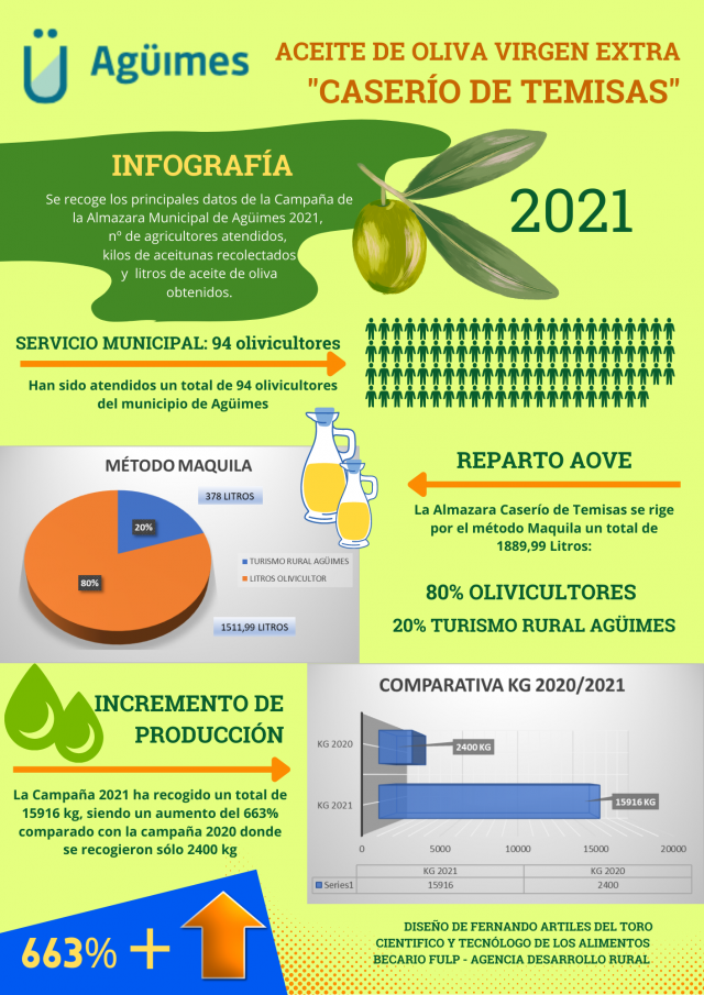 El resultado es un coupage, compuesto por un 65% Verdial, 25% Picual, 10% Arbequina, aportadas por 94 agricultores del municipio de Agüimes, de las que se han obtenido un total de 1.880 litros de aceite de oliva virgen extra, estando destinado el 80% de la producción a los agricultores y el 20% restante a su comercialización a través de la empresa Turismo Rural Agüimes S.L.