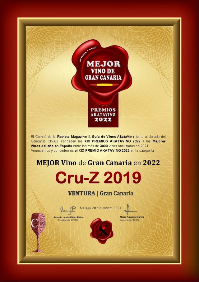 El vino CRU-Z 2019 de la Bodega Ventura ha sido seleccionado como el mejor de vino de Gran Canaria 2022. Este nuevo galardón, es el reconocimiento al arduo trabajo, repleto de sacrificios, riesgo, y también de talento y pasión, que destaca entre los mejores y buena prueba es la concesión de uno de los PREMIOS AKATAVINO en su XIX edición.