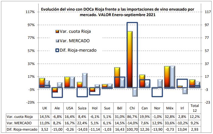 Sin embargo, las exportaciones de vino con DOCa Rioja a este mercado, según datos de la AEAT analizados por el Observatorio Español del Mercado del Vino (OeMv), crecieron en este periodo, un 87% en valor, hasta los 13,3 millones € y un +42% en volumen, hasta los 2,2 millones de litros, con precios medios también al alza, que se situaron en los 6,18 €/litro.