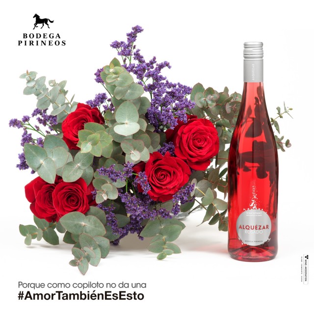 Mientras que, Bodega Pirineos, apuesta por su #rosadoconmáschispa, Alquézar Rosado, acompañado de un impresionante ramo con rosas rojas.