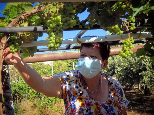 "Desde hace treinta y dos años resido en el municipio de Agüimes, después de casarme mi marido compró esta finca, le gustaba de siempre la tierra, la labranza, aunque su profesión era profesor de autoescuela. Compatibilizaba el cuidado de la finca con su trabajo, lo tenía todo muy bien cuidado, parecía un bosque, la gente cuando nos visitaban tenían que bajar las cabezas para que no rozaran con los racimos y mira que las parras estaban altas. Cuando llegamos a esta finca ya habían plantadas parras, después continuamos podando y plantando otras nuevas. Tras morir mi marido continué su tradición de cuidar y mimar nuestras parras".