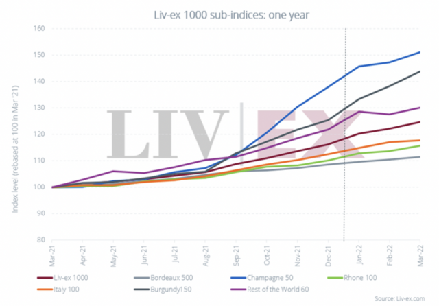 “Se observaron ganancias particularmente sólidas para Borgoña y Champaña en el Liv-ex 1000 (que es la medida más amplia del mercado secundario), señaló, cuyos subíndices para esas regiones aumentaron un 14,6% y un 9,6% respectivamente.”