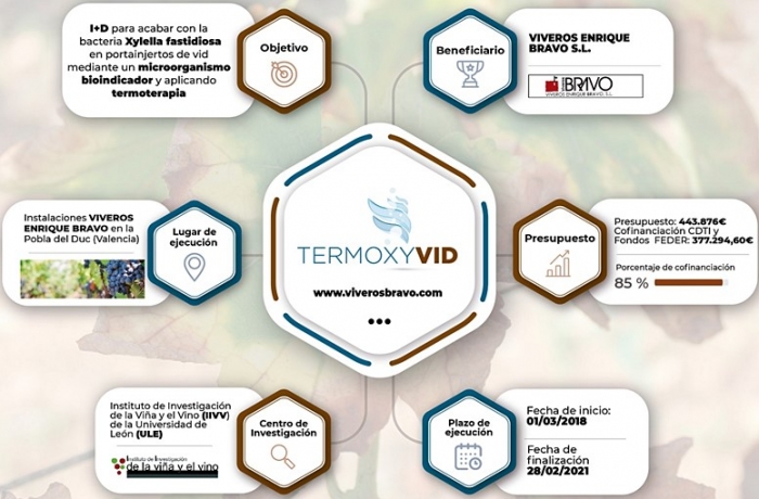 Tras tres años de desarrollo, el proyecto de I+D Termoxyvid llega a su final con importantes avances con respecto a la aplicación de la termoterapia para controlar a nivel industrial la bacteria Xylella fastidiosa en protainjertos de vid. Además, se ha logrado asegurar que el tratamiento realizado no tiene un efecto perjudicial para el material vegetal. La empresa Viveros Enrique Bravo ha liderado esta iniciativa, que ha contado también con la participación del Instituto de Investigación de la Viña y el Vino de la Universidad de León, así como con el apoyo financiero del CDTI mediante fondos FEDER de la Unión Europea.