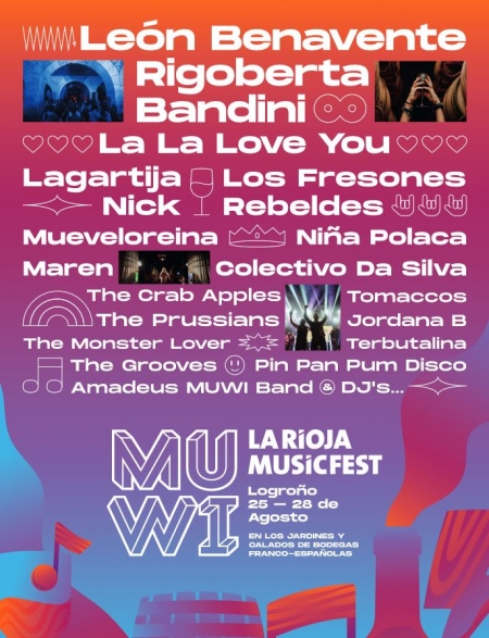 MUWI La Rioja Music Fest viene cargado de novedades, con el anuncio de que ha puesto sobre la mesa el cartel completo con los artistas que harán de esta sexta edición la más contundente hasta la fecha. A los ya conocidos cabezas de cartel: León Benavente y Rigoberta Bandini, además de La la love you , Lagartija Nick, Mueveloreina, Maren, Niña Polaca, Colectivo da Silva, The grooves, Jordana B, Terbutalina se ha sumado una última tanda con la que se cierra la propuesta de bandas y artistas: Los fresones rebeldes, The crab apples, The monster lover, The prussians, Tomaccos, Pin Pan Pum y Amadeus MUWI Band. Sólo nos quedarán conocer los DJ's de esta edición.