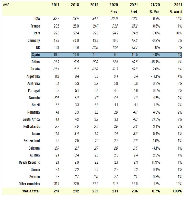 De este modo, las cifras hablan por sí solas. El consumo de vino en España está entre uno de los más altos a nivel internacional. De hecho, somos el octavo país del mundo en consumo de litros por persona, con un total de 26,2 litros de media, según Statista. En cuanto al consumo global, España ocupa la sexta posición, solo superada por Reino Unido, Alemania, Italia, Francia y Estados Unidos, según los datos del reciente informe OIV (abril 2022).
