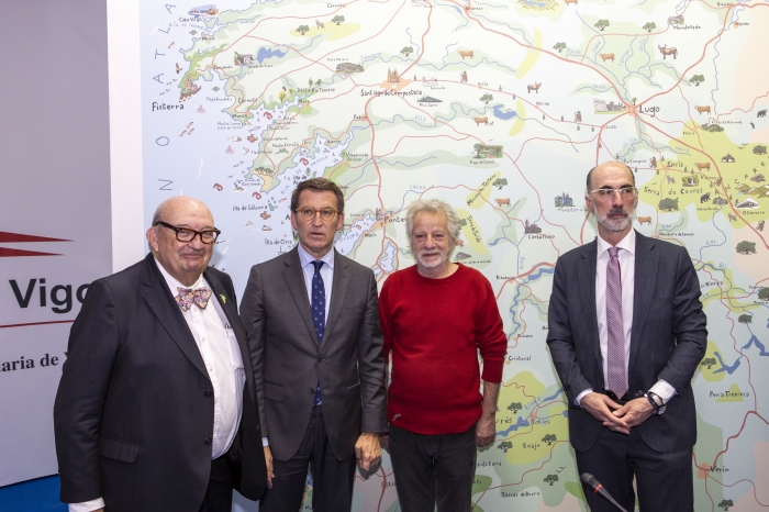 Javier Mariscal ha diseñado un mapa de Galicia para Bodegas Terras Gauda, que ha presentado durante su participación, como miembro del jurado, en la entrega de los premios de la 15ª Bienal Internacional de Cartelismo – Concurso Francisco Mantecón en la Estación Marítima de Vigo. El presidente del Grupo Terras Gauda, José Mª Fonseca Moretón, y el vicepresidente ejecutivo, Antón Fonseca Fernández, han querido obsequiar a Alberto Núñez Feijóo con el mapa nº1.