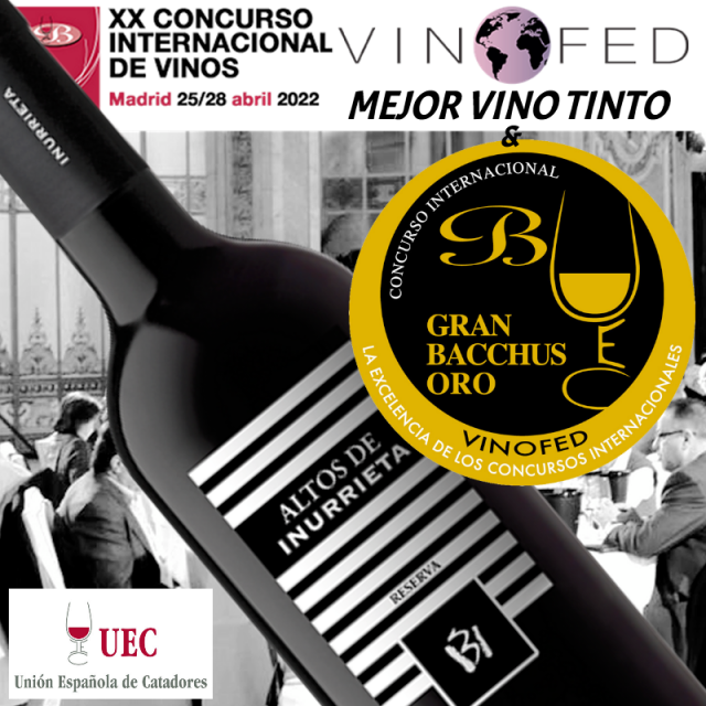 Nuestro Reserva Altos de Inurrieta 2017, ha sido doblemente galardonado en el Concurso Internacional de Vinos Bacchus 2022, con los mejores premios que se pueden conceder, premio al Mejor Vino tinto Vinofed del concurso, y Gran Bacchus de Oro.
