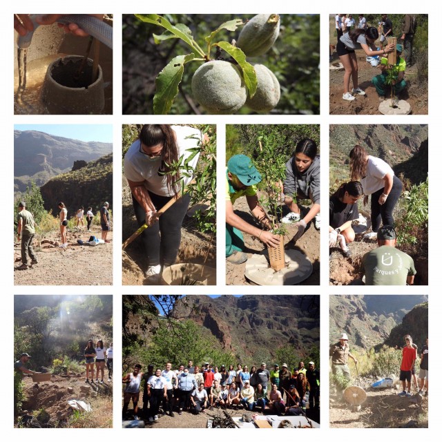 Se plantaron 15 almendros, en una finca colaboradora en Guayadeque, que han sido germinados por el alumnado del aula enclave del IES Playa de Arinaga, coordinado por el profesor de Educación Física, Antonio Jorge Hernández Monroy. En esta acción de reforestación, participaron un grupo de 25 jóvenes, de 15 a 21 años, de 4º ESO y el aula enclave, acompañados por sus profesoras María del Mar Sánchez y Judith Martel. Los trabajos comenzaron hace seis meses, en octubre del año pasado, tras recolectar almendras durante una visita al municipio de San Mateo. Los jóvenes han seguido al detalle el ciclo de crecimiento de los ejemplares de almendros. Pero, no se trata de su primera experiencia en agricultura, son los responsables de dinamizar el huerto escolar, donde cultivan verduras, hortalizas y otros árboles frutales.
